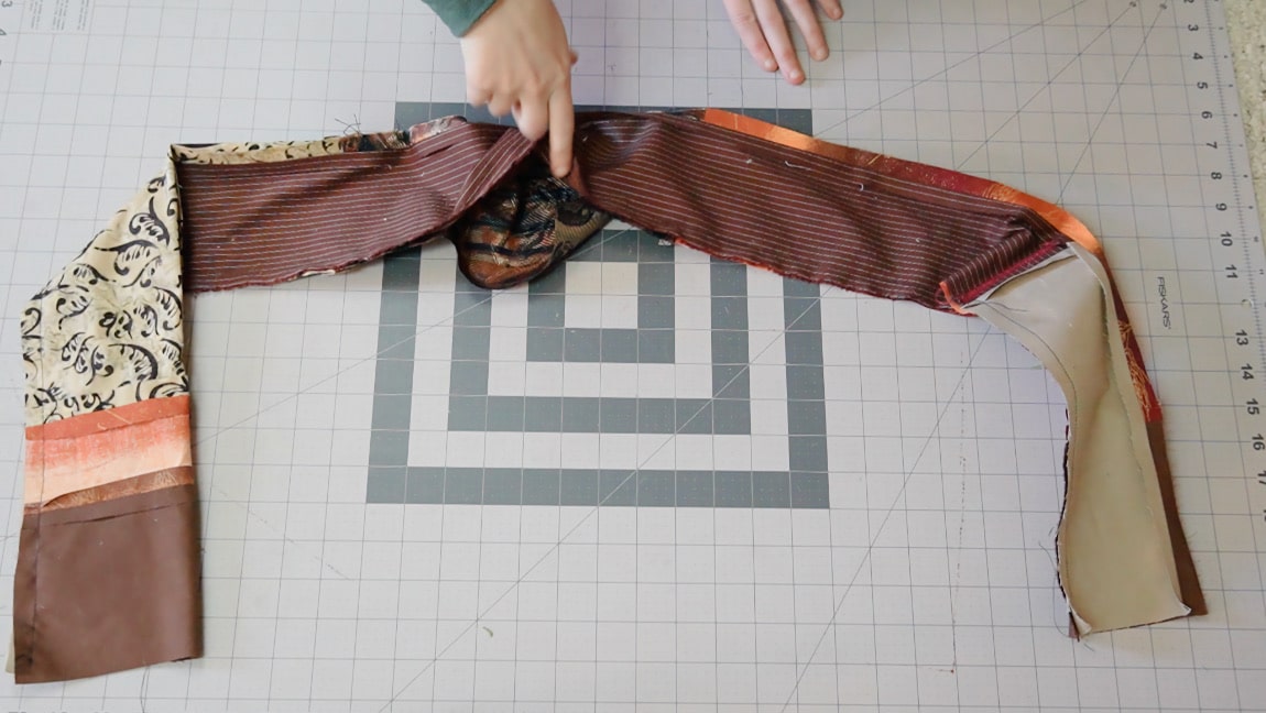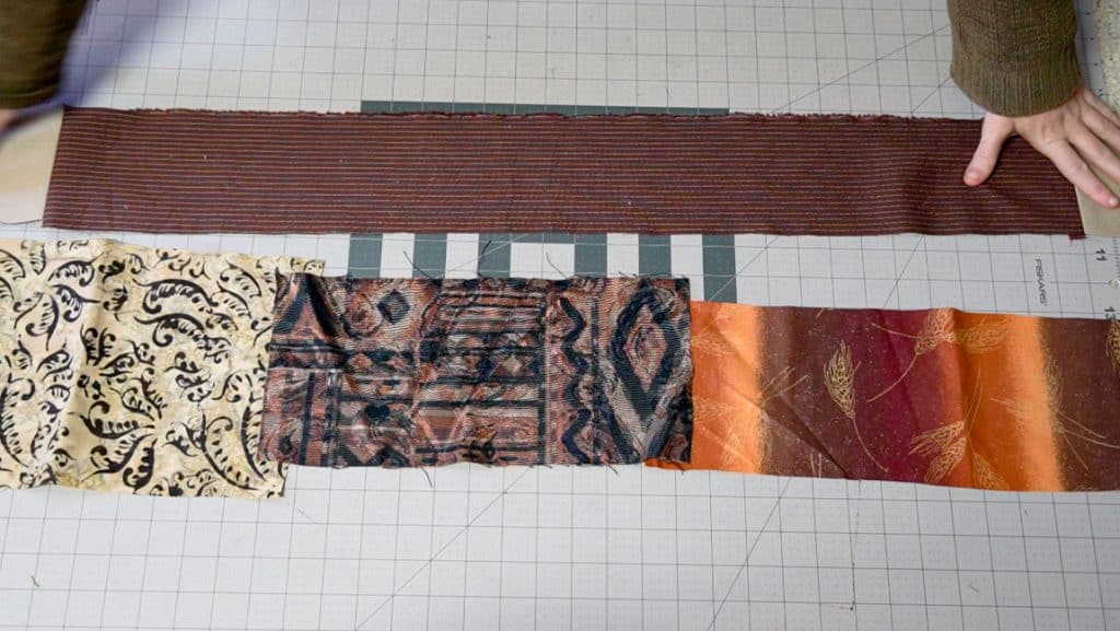 Lay out your fabric scraps and start organizing them into a collage. Make sure the scrap collage is big enough for your final draft stopper measurements (it’s okay if it’s bigger, you can trim the fabric later). Remember to overlap the fabric pieces to account for seam allowance.