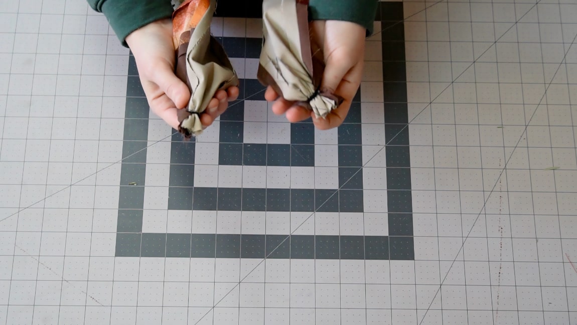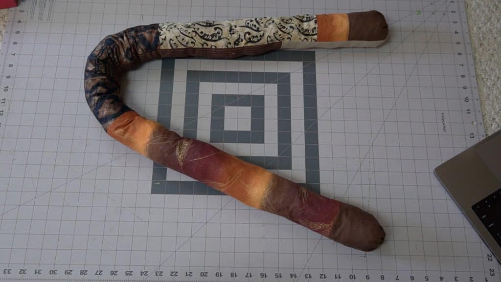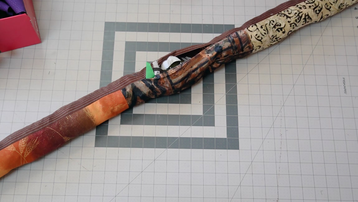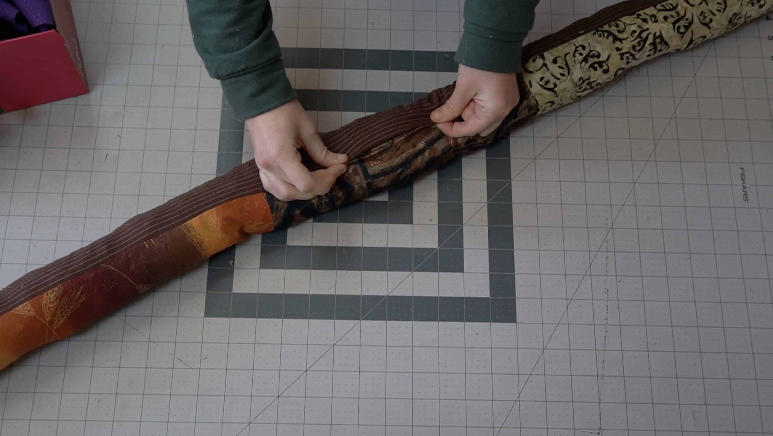 Use the gap in the middle to turn the draft stopper to the right side. Both ends should now have the fabric gathered to the inside of the fabric. This will allow it to more easily hold a cylinder shape.