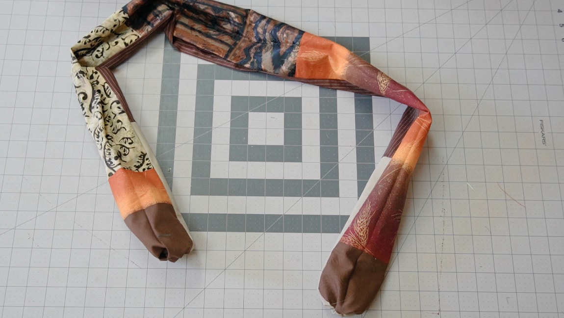 Fold the fabric in half to form a long narrow rectangle, then sew along the length. Leave a gap somewhere in the center so you can turn it to the right side later. The two short sides are still open.