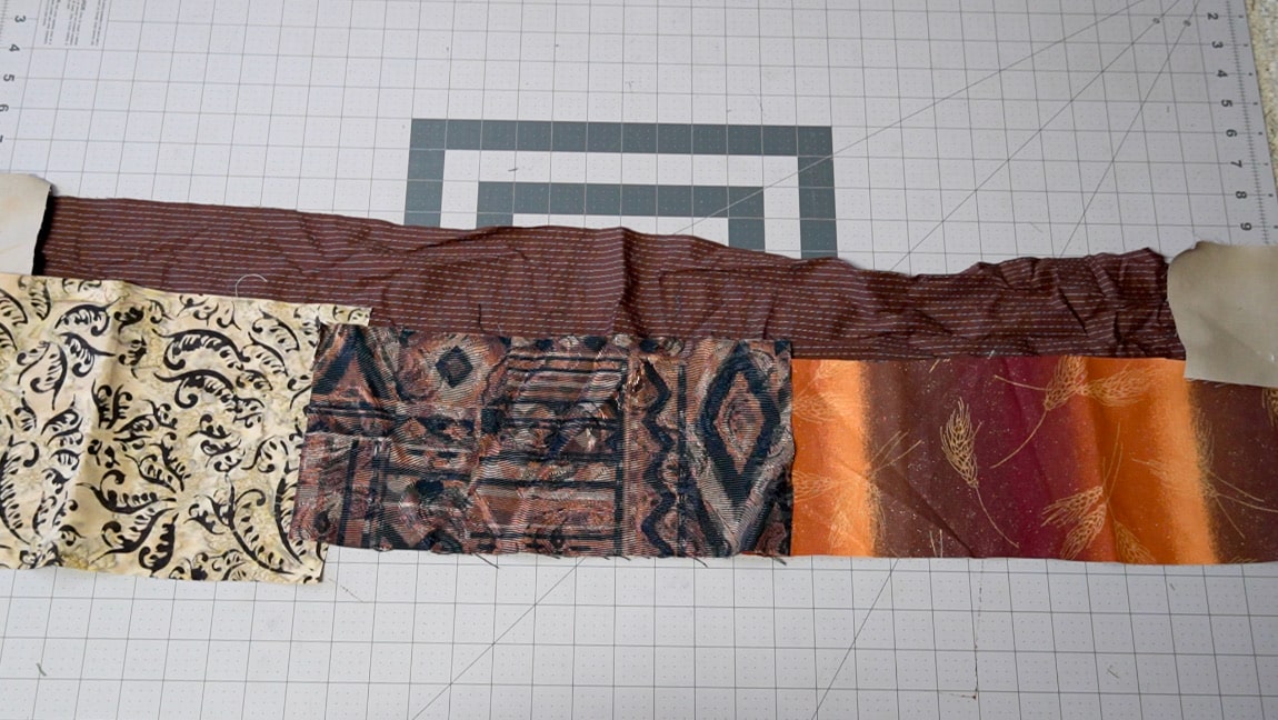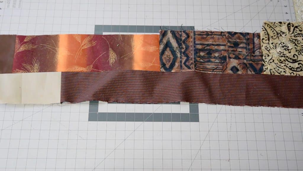 One by one sew your scrap pieces together. I usually start by sewing smaller pieces into chunks, and then add on the bigger pieces.